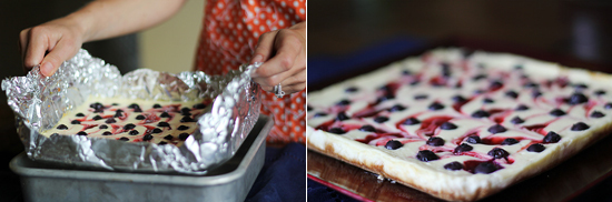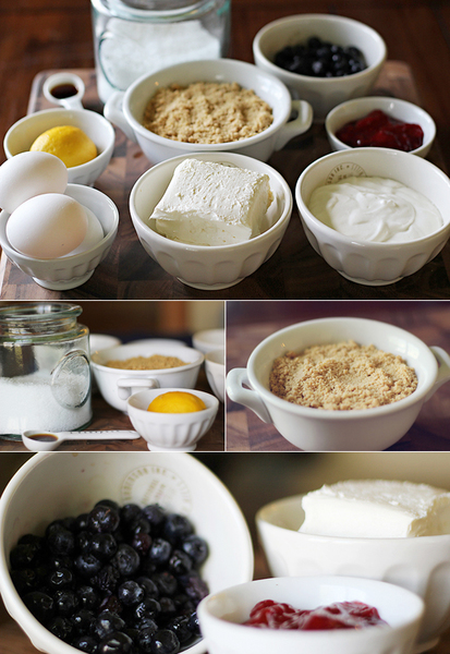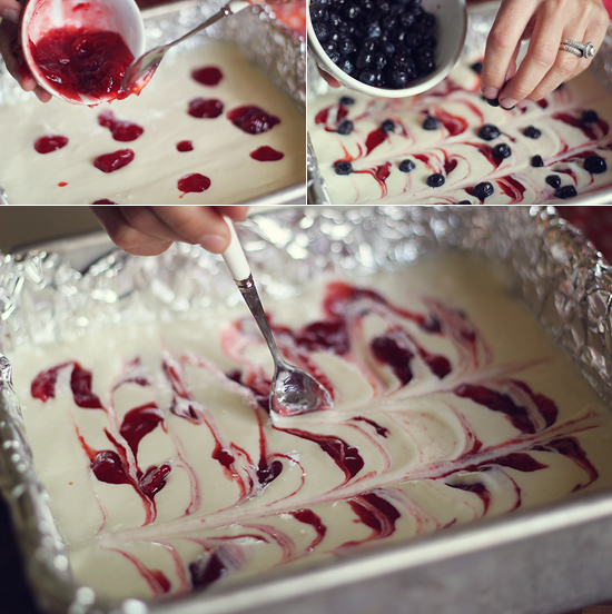 Drop jelly (by the spoon-full) over cheesecake filling. Drag a spoon (or knife) gently through filling to create marbling. Drop blueberries evenly over cheesecake. Place in the oven, bake for 30-35 minutes, or until cheesecake is almost set in the center. Let cool, and chill in the refrigerator for a few hours, or overnight.