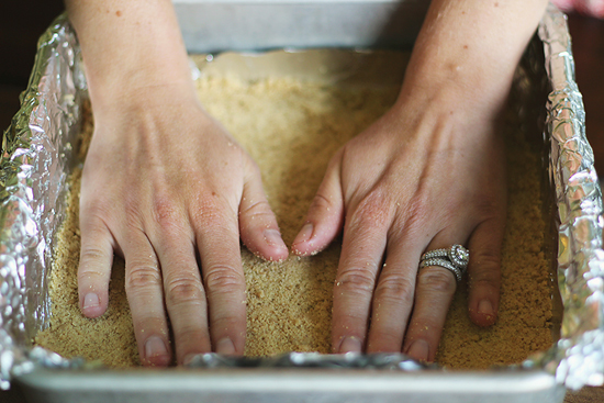 Remove graham cracker crust from pre-made pan, and crumble/press it down, re-forming it into your foil-lined pan. Put crust into the oven to bake for 8 minutes, then remove from oven.