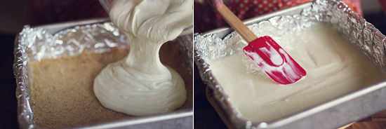 Pour filling over graham cracker crust, smoothing out filling with a spatula.